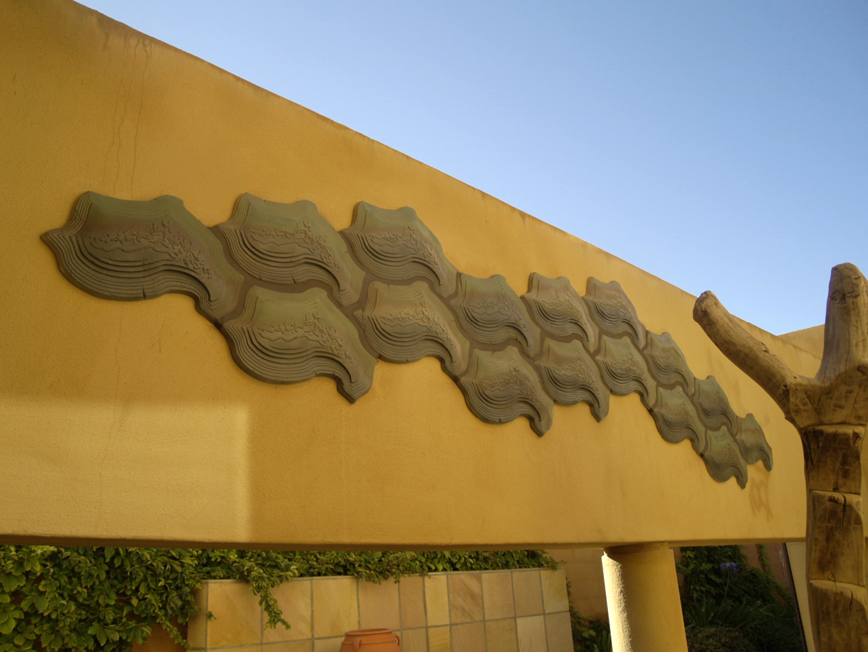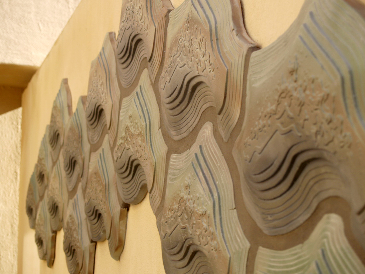Kommetjie is a small, rugged area along the east coast of Cape Town. It can be windy sometimes and this is reflected in the waves as they come rolling onto the powdery, white sand. This piece was commissioned with the seascape in mind, and it captures the sense of movement and the cyclical nature of the tide as it crashes and subsides. This has a nice matt glaze finish and a subtle metallic surface that is highlighted by the shape and contours of each tile. The tilers who installed it said this was an unusual artwork and quite rare in South Africa. They were trying to encourage me to open for business in Cape Town but its a little out of my way.