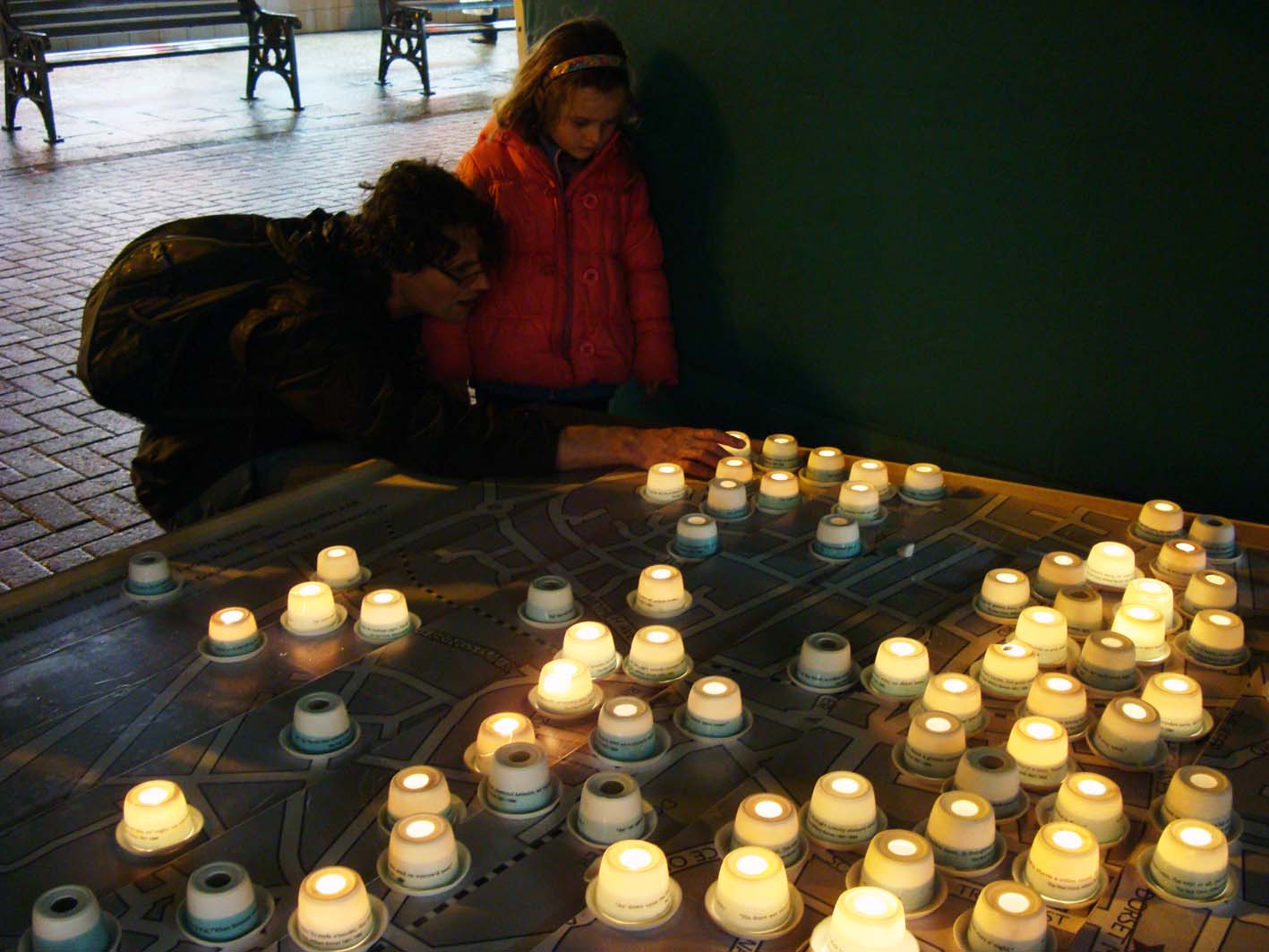 Each one contained a couplet from The Year Clock, a poem about the passing of the seasons, written in the old Dorset dialect by local poet and writer William Barnes. During the shortest day of the year, 200 candles lit up the interactive map, before the candle holders were taken home by the participants. What was so beautiful about this piece was the emotional resonance that people willingly left, with memories of loved ones lost, and houses sadly left behind. It is very hard to engage with people in such a meaningful way through a single interaction, but the installation had a depth and sincerity that allowed the participant to trust and believe in the process. The memories can be seen printed on a series of bespoke clocks strategically placed around Dorchester.