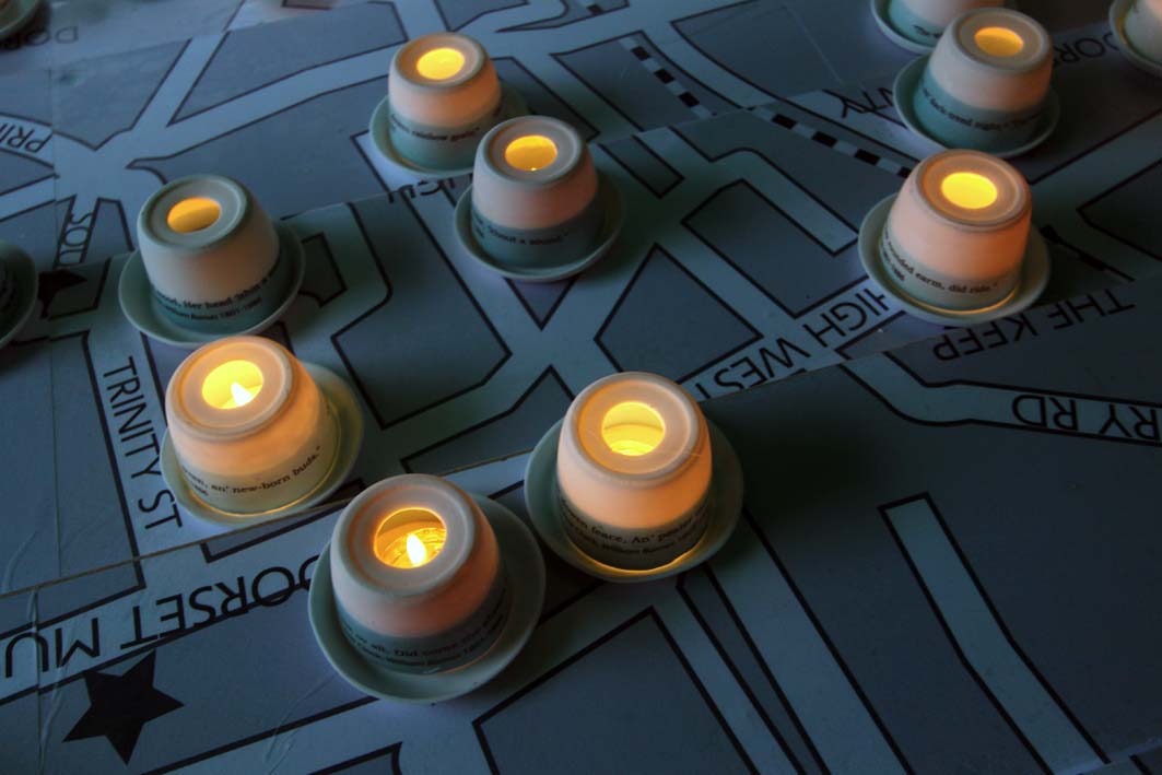 Dorchester is an historic and well-preserved town of significance in the county of Dorset, therefore it has a real sense of its own identity and past. There is evidence of neolithic and stone-age settlements, a bustling roman town, as well as the presence of its favourite son, Thomas Hardy. As part of the research phase, I was keen to get an understanding of Dorchester from a personal perspective, and to celebrate the memories of the inhabitants. On the Winter Solstice of 2013, participants were invited to light a candle for Dorchester and leave a personal memory behind in exchange for a unique bone china candle holder.
